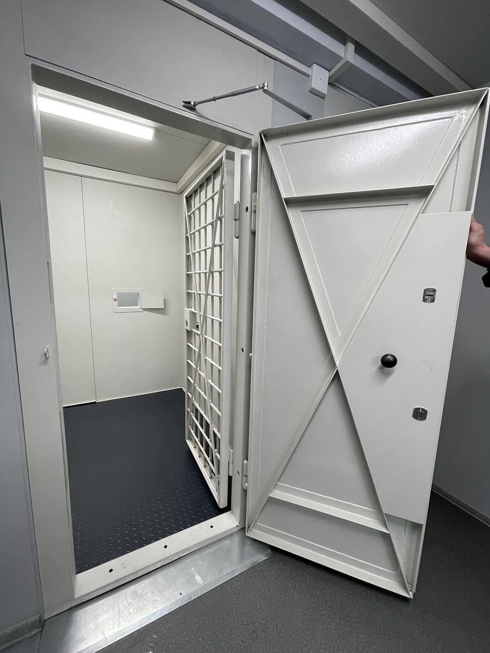 Очередной нестандартный проект. Отделка фасада металлическими кассетами собственного производства, внутренние стены усилены металлическим листом и решеткой, отделка стен панелями гипсоакрил и плиткой, отделка потолка СМЛ панелями. Здание оборудовано автоматическими усиленными рольставнями (4 класс). Часть помещений имеют бронированные окна и двери.